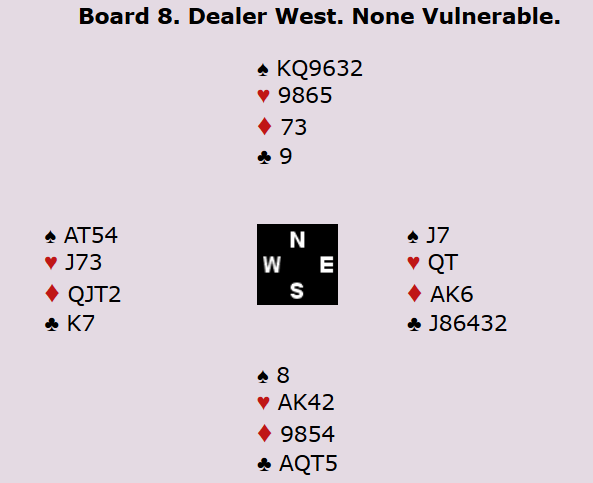 Norges lag i åpen klasse hadde altså en viss utur som fikk 11 IMP ut på spill 4. På spill 8 var det andre årsaker som gjorde at det ble en ny stor sving ut: