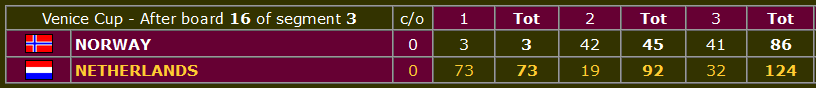 Halvveis i kvartfinalen leder Norge med hele 100 IMP på Italia i åpen klasse etter å ha vunnet de tre settene i dag med henholdsvis 40, 30 og 30 IMP! Mye skal gå galt om de nå ikke går videre til semifinale (bank i bordet). Men det er fortsatt 48 spill igjen, og det er viktig å være fokusert selv om man leder mye.