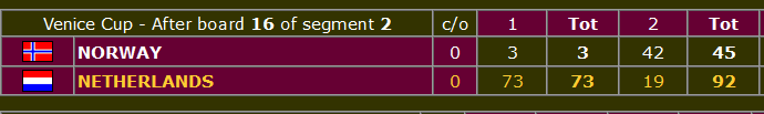 Damene fikk deessverre en fryktelig tung start mot Nederland. De har ikke vært i nærheten av å tape en 16-spillskamp med 70 IMP tidligere i mesterskapet. Kjedelig at det skulle komme et sånt resultat i kvartfinalen, men sånn ble det nå en gang. Heldigvis kom Norge tilbake i andre sett og hentet inn omtrent en tredel av forspranget. I dagens siste sett ble det nokså jevnt. Nederlenderne har selvsagt et godt utgangspunkt før dag to, men Norge har ikke gitt opp å hente inn forspranget. La oss håpe Norge får en god start på dag to!