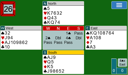 Et par spill senere var det Nils som skulle prøve seg i majorutgang, nærmere bestemt 4 spar doblet: