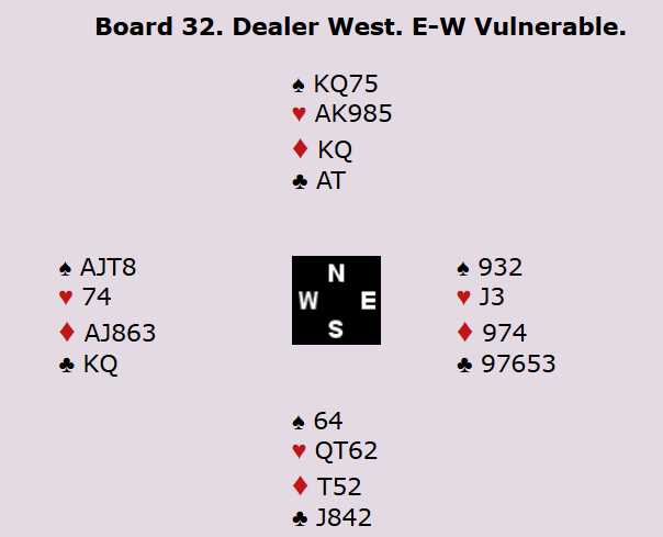 Over 1 grand fra Madala i nord gikk Nils inn med 2 ruter, som viser ei majorfarge (2 i major er mer konstruktivt). Syd passet i første omgang før Ulf meldte 2 spar, som viser at han har lengre hjerter enn spar og er villig til å være med til 3-trinnet om makker har hjerter. Nord sa pass, og det gjorde Nils også! Duboin i syd hylte 3 grand, og det ble sluttkontrakten. Nils spilte ut hjerter, og motspillerne fikk etter hvert fire hjerterstikk, ett ruterstikk og kløver ess. To beit i kontrakten.