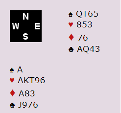Hun kan se at motparten har bare ett stikk til sammen i hjerter og kløver. Så er spørsmålet hvor mange stikk de har i spar og ruter. Man kan jo egentlig ikke forvente at makker har særlig mye å bidra med, og med 6-korts kløver og singleton ruter er det slettes ikke usannsynlig at nord kan ha 5-kortsfarge i ruter.
