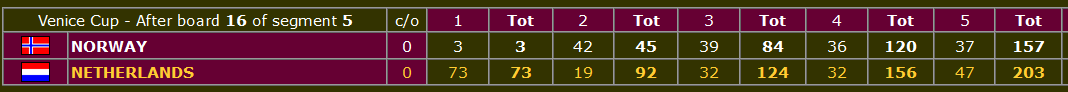 Dameklassen: Norge - Nederland 32 - 25 Norge er dermed 29 IMP bak med 24 spill igjen