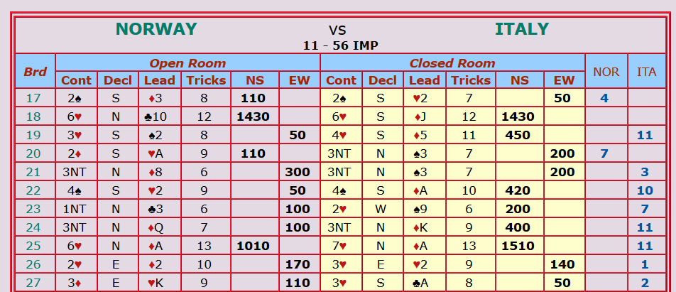 Åpen klasse: Norge - Italia 3 - 13 Norge leder dermed med 76 IMP med 24 spill igjen