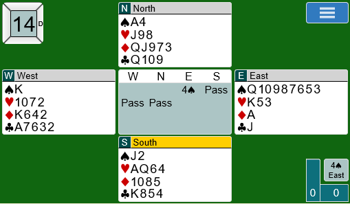 I spill 14 fikk syd en utspillsprøve. Med ingen i sonen åpnet øst med 4 spar i første hånd. Hva ville du spilt ut?