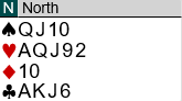 Det kan fort ende med at spillefører må løse trumfen uten taper i og med at det ser ut til å bli en taper i hver av de andre fargene. Det er ikke all verdens med inntak i nord. Normalt vil man spille liten mot ess-dame første gang. Når dama står, og nieren eller tieren faller bak, er det kanskje naturlig å tro at det enten er singleton eller 10-9 dobbel.