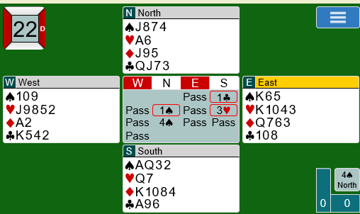La oss si meldingene går omtrent slik: 1 hjerter fra syd, 1 spar fra vest, 3 hjerter fra nord, 3 spar fra øst, og vest avslutter meldingene med 4 spar over syds 4 hjerter. Ett sted gikk meldingene 1 hjerter (syd), dobler fra vest, 3 hjerter fra nord, dobler fra øst (!), 4 hjerter fra syd og 4 spar fra vest med pass rundt.