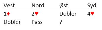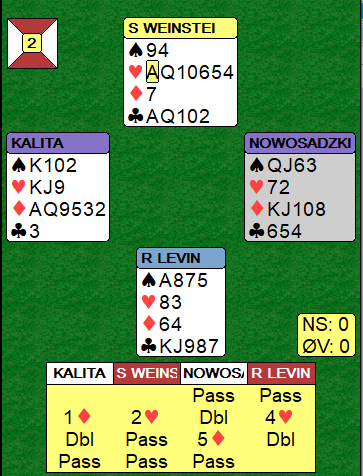 Det er lett å si at i gunstig sone må han ta en billig forsikring og melde 5 ruter. Joda, men det kan godt være en bet (eller to?) i 4 hjerter og en bet eller to i 5 ruter også. Da er det dumt å melde 5 ruter! Makker har gode verdier når han dobler 4 hjerter, og poenget her er vel at vest ikke vet om Nowsadzkis gode rutertilpasning. Det er neppe mange ruterstikk å hente i motspill! Jeg tror nok polakkens avgjørelse er den beste i det lange løp, han meldte 5 ruter.