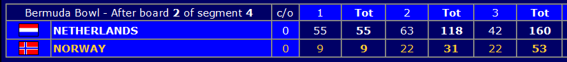 Det svenske damelaget har full kontroll i semifinalen mot England. De leder med 95 IMP med 16 spill igjen å spille. I finalen møter de etter alt å dømme Kina som i øyeblikket er nesten like overlegne mot Norges «overkvinner» i kvart’n, Nederland. For Sverige spiller Kathrine Bertheau, Sanna Clemetsson, Ida Grønkvist, Jessica Larsson, Emma Ovelius og Cecilia Rimstedt.