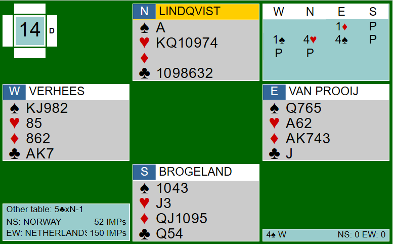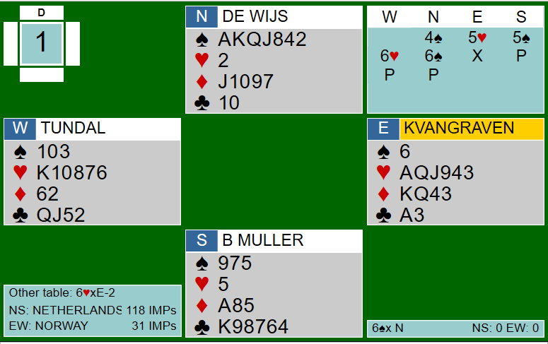 Ved det andre bordet var de fire første meldingene identiske, men nederlenderen i nord fant det for godt å meldte en gang til på sparfarga si: