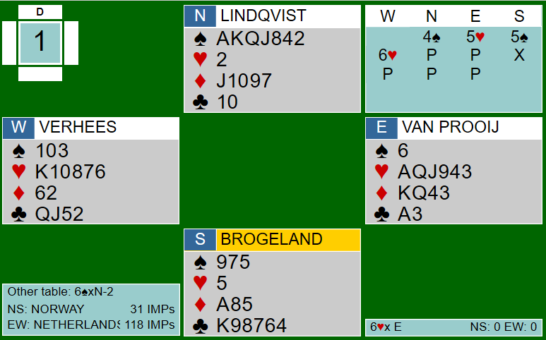 Øst var med til både 5 spar og 6 spar. Jeg regner med at pass var krav fra vest både over 5 ruter og 6 hjerter, og at det kan ha indikert interesse for å melde videre. Det var en morsom vei til endestasjonen 7 hjerter doblet. Spilleføringa var nok raskere overstått enn meldingsforløpet. Det må ruter ess ut fulgt av ruter til stjeling for å få tre beit. Aktuelt ble det spilt ut spar konge, og da ble det bare to beit. Siden kløver ess satt foran kunne Boye kaste en ruter i bordet på det andre kløverstikket. To beit og 300 ut. Dermed 11 IMP til Nederland.