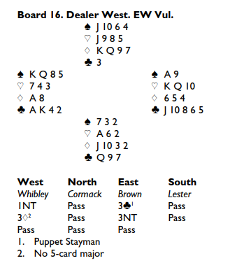 Paradoksalt nok tapte Whibley spillet (+600) da nord ved det andre bordet hadde vært med og doblet for å vise begge major over vest sin sterke 1 kløveråpning. Da vest også der var i 3 grand spilte han på 3-1 sits i kløver og tok en vellykket kløverfinessen med to overstikk som resultat. Det ga 2 IMP inn til en eller annen, men det var Whibley som vant IBPA-prisen!