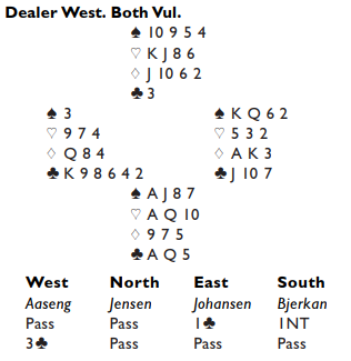 Mot 3NT spilte nord ut spar knekt. Idet spillefører tar det stikket og bommer kløveren (ingen indikasjoner som gjør at det er grunn til å ta kløverfinesse) bør det ikke være så vanskelig for forsvaret å finne ruterskift med en bet som resultat. Skjer det rekker ikke spillefører å godspille hjerterstikk. Ved mange bord var dette nettopp det som skjedde.