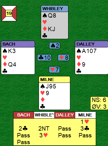 De tok altså ikke de fem første, men det ser ut som om det ikke koster noe, for spillefører har kun ett avkast for spar. Milne så imidlertid en mulighet da han vant for kløver konge i fjerde stikk – en innspillsmulighet. Han kjørte igang med trumfene sine, og slik så det ut før den siste (merk at spillefører har latt ruter K-J ligge hos blindemann uten inntak):
