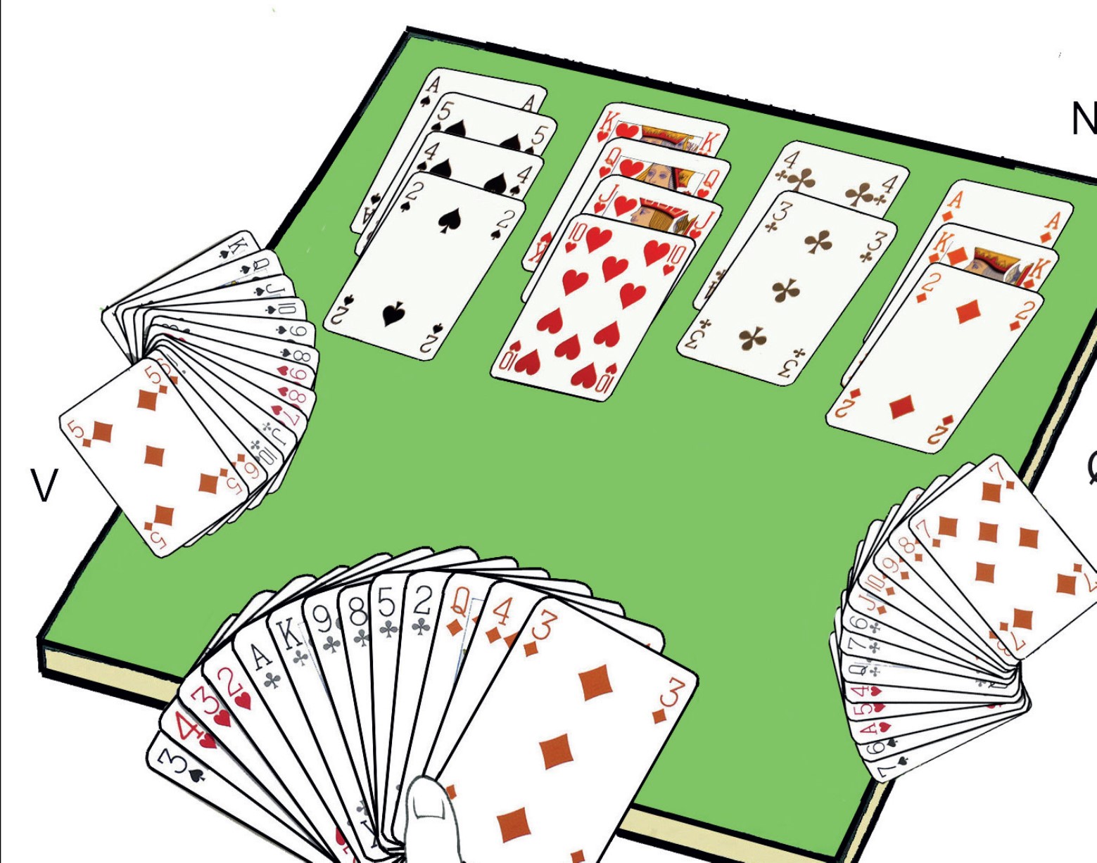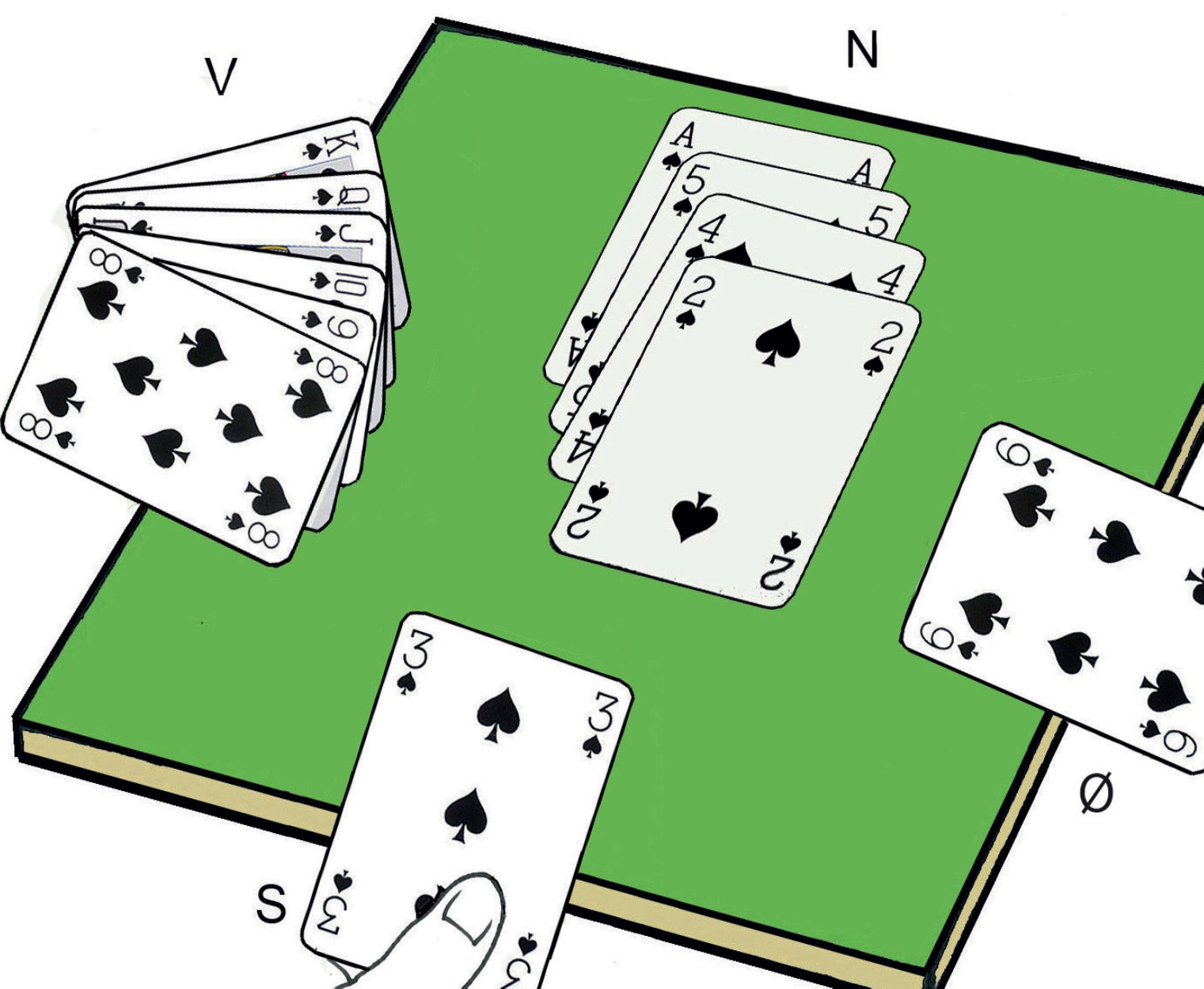 Vi lar altså Vest vinne de to første stikkene på spar K og spar Q. Deretter tar vi det tredje stikket med spar A og spiller inn Øst på hjerter A. Seks stikk i de andre fargene pluss tre i hjerter gir ni stikk totalt.