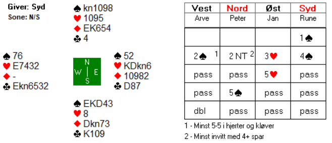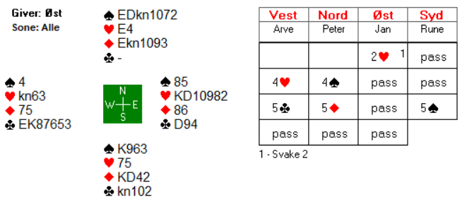 Meldingsforløpet i utsspillprøven er hentet fra åpent rom, hvor Arve Farstad satt i vest. Han spilte ut hjerter ess, og da var det ikke lenger mulig å beite kontrakten siden spillet så slik ut: