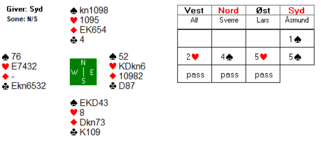 1 spar fra Åsmund var begrenset til 15 poeng, og dermed valgte Sverre å ta sjansen på at det ikke sto slem. Å hoppe til 4 spar setter motparten under mer press, og kanskje øker det sjansen for å få kjøpe kontrakten?