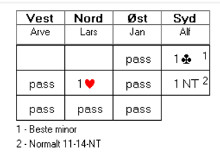 Sverre Johnsen og Åsmund Stokkeland spiller med et sterkt kløversystem der 1 kløver enten viser 17+ uansett fordeling eller en 10-13-grand. 1 ruter er naturlig, og lover normalt minst 4-kortsfarge. Det er kun i noen spesielle tilfeller at det kan være på 3-kortsfarge. De fikk meget god kontroll på spillet, og havnet i 3 grand etter følgende meldingsforløp:
