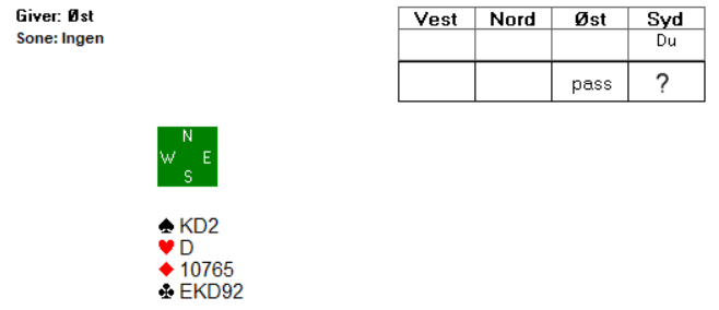 Åsmund fikk vist akkurat hva han hadde, og dermed var det ikke vanskelig for Sverre å lette til utgang. Det var naturlig for Sverre å nøye seg med 2 ruter i andre melderunde da 2 kløver i utgangspunktet er å betrakte som 11-14 hp. Om makker har mer enn det, melder han en gang til over 2 ruter.