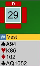 Det normale utspillet med en slik farge er liten kløver. Det gjør at du kan får bra uttelling (fire kløverstikk) selv om for eksempel spillefører har K-J-x, men det forutsetter at makker kommer inn og kan spille kløver gjennom. Her har vest så mye at det ikke er sannsynlig at makker kommer inn. Noen ganger med en slik fargekombinasjon kan damen i utspill være tingen. Det er også om det er makker som har inntak, og du forventer at bordet kommer ned med kongen. For eksempel er dameutspillet jackpot hvis bordet har Kxx og spillefører Jxx så vi kan spille gjennom syds knekt senere med A-10 bak. Men altså, utspill er "blindt" og man vet jo ikke med sikkerhet hvordan det sitter.