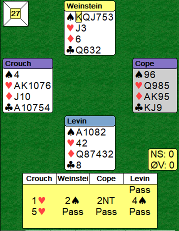 Mot Peter Crouch sin 5 hjerter spilte nord ut spar konge før han skiftet til sin single ruter. Slik meldingene hadde gått ved det bordet hadde Crouch en nesten sikker kløvervariant, for nord måtte ha fire kløver! (6-2-1-4). Crouch tok for kløver ess og spilte kløver til knekten – tolv stikk og vunnet spill!