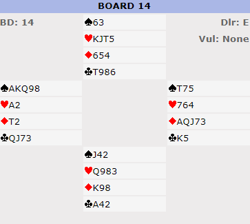 Syd stakk og spilte hjerter. Spilleførers sjanse var nå at han fant kløver ess hos nord slik at ruteren kunne hentes, men da syd stakk kløver konge med esset var det slutt, østs hånd var en ørken. Spillefører kunne ikke unngå en taper i hjerter og en taper til i kløver til nord som sammen med ruter konge ga beten. Det er nok svakt spilt, men likevel et fint motspill av makker. ¨