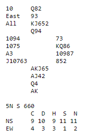 Spilleføringen var en formalitet, kløverfargen gikk, men kunne også ha blitt godspilt med en stjeling. Merk at her ville ikke Roman Key Card Blackwood gjort nytten (det ene nøkkelkortet som vises av åpneren kan jo være hjerter ess), men Exclusion Blackwood i hjerter ville gjort samme nytte som 5NT. Uansett, nedlegg storelsem meldt på en og en halv melderunde med 21 HP til sammen, ved hjelp av de to gamle, men nyttige konvensjonene "Svake 2 ruter" og "Store frie 5NT".