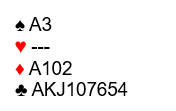 Ved bordet tok spilleren med disse kortene en ikke urimelig sats da han hoppet rett i 7 ruter. Da nestemann (Jomar Lygre Undheim) doblet innså storeslemmelderen at han nok hadde satset feil. Og det var da også skivebom da makkeren hadde åpnet med dette: