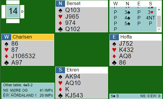Å vinne 5 kløver var sammen med en bet i 4 spar ved det andre bordet verd 10 IMP for Møre og Romsdal som vant kampen. Hordaland 1 (Charlsen) leder imidlertid mesterskapet forstatt, med en halvrunde og en hel kamp igjen å spille på søndag. I bunnstriden er det fortsatt (som vanlig) jevnt, og hvem som rykker ned )og opp fra 2.divisjon) blir ikke avgjort før siste kort er spilt.