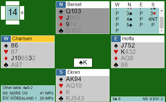 Ekren var altså i 5 kløver som heller ikke er nedlegg, men kontrakten har gode sjanser siden hjerterfinessen går. Det kom hjerter 8 ut til liten-liten, og syd vant stikket. Så trumf, og vest vant andre gang for å fortsette med hjerter som igjen gikk til liten - liten og syds dame. Den siste trumfe ble tatt ut med nords tier, så ruter mot syd. Øst stakk med esset og fortsatte med ruter dame da syds konge kom på under esst. Nå tok spillefører for hjerter ess før den siste trumfen ble tatt idet det så slik ut: