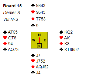 Lagkameratene våre spilte kløverkontrakt, men kunne nok slik meldingene gikk ved det bordet ha funnet frem til 6 grand spilt av øst. Både 6 kløver og 6 grand står nemlig uansett utspill om øst blir spillefører. De kom imidlertid bare til 5 kløver (vest), og vi tapte 12 IMP.
