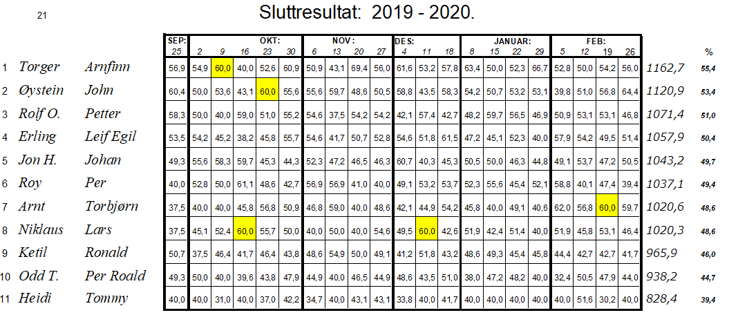 17 par deltok på¨6. og siste kveld i klubbmesterskapet. Kveldens vinnere ble Frank de Kinder - Dag Torgersen med 690.5. På de neste plassene kom Anne Grethe Dahlberg - Eldbjørg Grimsrud Gathe med 610,1 og Rolf Lassen Lersbryggen - Ole Tom Johnsrud med 607.1. Nå de to dårligste kveldene er strøket, ble det Anne Grethe Dahlberg - Eldbjørg Grimsrud Gathe som kan utropes til klubbmester 2020 med 2417. Men det var veldig tett i toppen. Finn Løken på andreplass fikk 2414 og Jan Steinar Mydland på tredjeplass fikk 2406. Vi gratulerter .