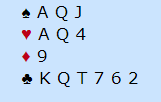 Brogeland satt med dette og hørte Silla (Sælensminde) åpne i første hånd og gunstig sone med 2 ruter, såkalt "søppelmulti", dvs. en svak, svake 2 åpning i en majorfarge. I gunstig sone behøver det ikke innebære særlig mye, men Brogeland måtte nesten satse på utgang? Han sa 2 grand – krav – og Silla sa 3 kløver som viste minimum med hjerterfarge. Nå kunne Boye etter deres metoder spurt om det var en ekstra dårlig minimum, eller om han hadde noe i hvert fall, men naturlig nok meldte han 4 hjerter. Tross alt trenger han ikke mer enn kongen femte i hjerter hos åpneren for at utgang skal være en god kontrakt.