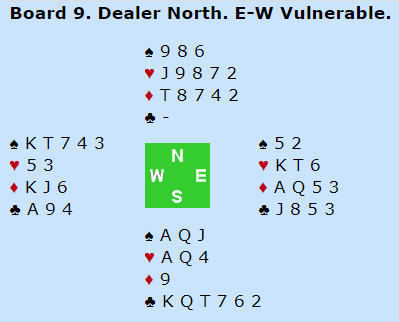 Mot 4 hjerter kom hjerter 5 i utspill til til syveren fra bordet, tieren og damen. Nå spilte Boye kløver dame. Den burde vest dekket, men da han la liten hadde nordmannen fått den lillefingeren han trengte for å kunne ta hele hånda. Kløver dame vant stikket, så kløver til stjeling og trumfåtteren som fikk seile. Neste trumf gikk til kongen og esset, og en tredje runde kløver ble spilt, vel og merke en liten kløver. Esset kom på, behagelig for spillefører, og Boye spilte spar til esset for å ta sine kløverstikk og ti stikk i alt (han var helt uten trumf nå).