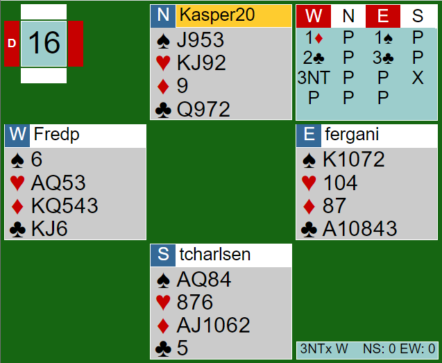 Ved det andre bordet spilte vest 3NT. Nord spilte ut stor hjerter. Nå er det to bet om nord skifter til ruter. Syd vinner med esset, og hjerter gjennom gjør at forsvaret får fem hjerterstikk pluss ruter ess. Nord fant imidlertid ikke det motspillet. Han dengte ned den andre store hjerteren i håp om damen dobbel hos vest, men da stod 3NT!