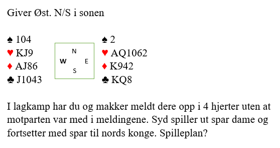 Tre runder hjerter avslører imidlertid at vest hadde tieren femte fra start, og øst som fulgte med liten og knekten før han kastet kløver i tredje hjerterrunde startet altså med dobbelton hjerter. Det er nyttig informasjon som du kan utnytte til å øke sjansen din litt. Følg med!