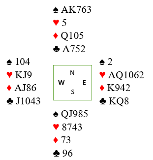 Tilbake til spilleføringen. Hvis du tenker på det med mulig skjev trumfsits og ser du kan bli «kort og rar» går det an å komme på vinnervarianten. Idet forsvaret spiller spar i andre stikk, kan spillefører la være å trumfe! I stedet kastes en ruter fra øst. Forsvaret har to stikk, men de kan ikke presse med spar lenger, for gjør de det kan spillefører trumfe hos vest og beholde lengden i trumf på hånden. Samme hva de spiller kan senere spillefører få tatt ut trumfen og beholde en trumf på hånden, så presses kløver ess ut. Med kun tre ruter igjen på hånden (en ble jo kastet i andre stikk) vil han så få kastet en ruter til på den fjerde kløveren og resten står. Det blir to spartapere (!) og en kløvertaper (0+5+2+3= 10 stikk).