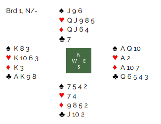 Makkeren min hadde meldt spar på veien, men Espen vant meldingene med 3NT i syd. 4 hj var vanligere, men ofte bet. Derfor var Espen allerede i en gunstig posisjon.