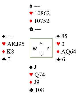 Det ser unektelig ut som et merkelig avkast, men det kan være riktig motspill fra hans synsvinkel. Nystrøm er nemlig den som holder både ruter og hjerter (lengden i hjerter). Hvis nord kaster hjerter, kan spillefører ta fem hjerterstikk ved hjelp av finessen (fargen sitter da 3-3). Og å kaste ruter fra fire-korts farge ser feil ut når bordet har A-Q fjerde og vest må ha kongen. Nystrøm var skviset i tre farger, og han kastet altså kløver dame, det kortet som kan være ufarlig å kaste hvis syd har knekten (merk at vests kort er skjult).
