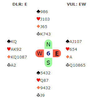 Om en ser kun på N/S sine kort er storeslem bra, den avhenger kun av 3-2 i hjerter. I så fall er det tolv majorstikk og ruter ess å hente. Siden hjerteren satt 4-1 var det ikke mer enn en lilleslem, men der var det ingen problemer. En ruter ble kastet på den tredje hjerterhonnøren, og forsvaret kunne ikke få mer enn for ruter konge.