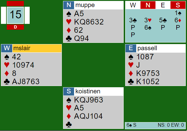 Etter 1 hjerter fra nord meldte Kauko 1 spar før Ø/V kom med i meldingene og det ble full gass. Over 5 kløver foreslo syd 6 ruter, en praktisk melding selv om han nok måtte ha vært litt bekymret for at det kan være en nedlegg storeslem. Åpneren kan jo godt ha spar ess, hjerter konge og ruter konge som gir tretten enkle stikk, og de honnørene er kun 10HP. Men når motparten sperrer så kraftig som her er det kanskje lurt å sikre seg lilleslem i hvert fall, for å finne ut med sikkerhet at det er en god storeslem i sånne meldingsforløp er ikke enkelt. Nord prefererte til 6 spar med pass rundt.