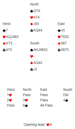 13 stikk fra topp uansett utspill. 3 par var i storeslem resten bare i simpel lilleslem. Så var det resultatet. Da Per dro første runde med hjerter var Syd renons. Altså var hj D tredje «på rygg» og store- slemmene måtte gå bet. Ganske surt, -100 i stedet for 2220 eller 2210 inn!