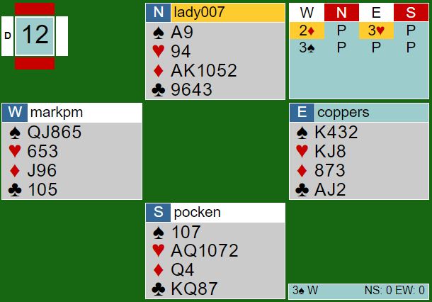 N/S var Marion Michielsen og Per Ola Cullin, internasjonale spillere av ypperste merke. Hvem burde meldt? Nord har ikke helt nok til 3 ruter direkte. Dobler er antaglig ikke ruterfarge for dem, men en opplysende dobling. Over 3 hjerter følte nok syd seg litt robbet, men igjen vil dobler være opplysende vil jeg tro? Her er det flere avtalespørsmål som mange makkerpar ikke har besvart. Idet syd passet og vest korrigerte til 3 spar og det gikk pass-pass kunne kanskje syd doblet? Vel, det er lett å si det når en ser hva nord satt med.