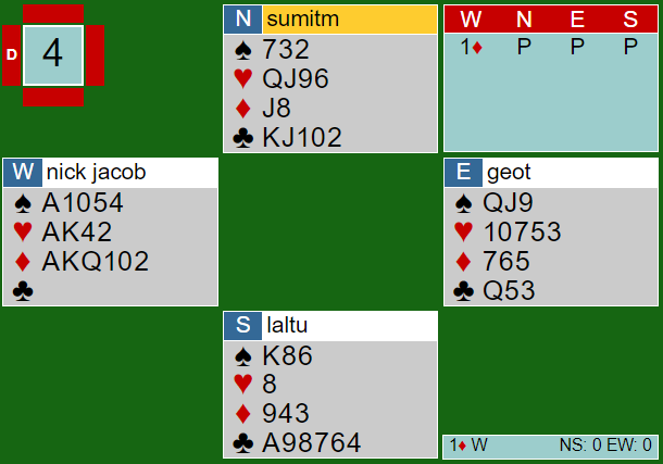 Vest (Nick) var i 4 hjerter etter at syd hadde hoppet inn med en svak 2 spar over min 1 kløver, og N/S hadde vært med til 3 spar.