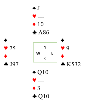 Spillefører må få godspilt ett ruterstikk for ett kløveravkast, så få til et innspill mot slutten. Ruter må altså angripes tidlig. Hvis det startes i andre stikk med ruter til damen og esset og nord spiller mer spar, ruter eller trumf går det bra. Det spilles liten trumf til knekten og damen, så ruter til nieren og kongen. Syd kan fri seg med ruter, og en kløver forsvinner fra vest. Så spilles trumfesset og trumf til tieren. Dette er igjen: