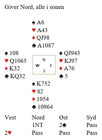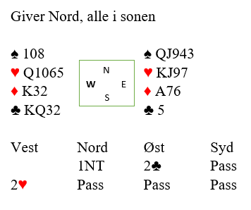 Du sitter altså vest og har havnet i 2 hjerter etter makkers 2 kløver som viste begge major over motpartens åpning 1NT. Det ville vel ikke vært noe å si på om du hadde invitert til utgang, men kanskje blir det kun åtte stikk. Dette var i parturneringen, og om det ikke blir ni stikk så er det jo glimrende å ha stoppet.