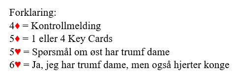 Hvis Ø/V har det nevnte kravet til fargekvailitet for det positive svaret 2 spar behøver egentlig ikke vest spørre om trumf dame for å finne ut om det kortet, men spørsmålet gir mer informasjon også. Hvis øst ikke har trumfdamen meldes 5 i trumffargen (så kan vi noen ganger stoppe der). Hvis han har trumfdamen, men ikke mer å fortelle om hopper han til 6 i trumffargen. Andre meldinger viser trumf dame samt kongen i den fargen man melder.