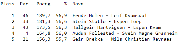 Fredag startet parfinalen i Kragerø. Det er 48 kvalifiserte par, og de skal spille tre spill mot hvert av de andre parene. Etter 60 spill har Frode Holen-Leif Kvamsdal fra Sogn og Fjordane en knapp ledelse. De fem beste parene så langt er: