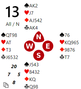De havnet i 6 kløver uansett, og øst spilte ut trumfenieren. To runder trumf viste at øst hadde J-9 dobbel fra start, trumfen satt altså 2-2. Det ser ut til at ruteren må tippes. Enten spille kongen fulgt av finesse, eller toppe ruterfargen. Det er ganske liten forskjell på de to mulighetene, men i teorien litt større sjanse for å toppe etter damen med ni stykker til sammen.