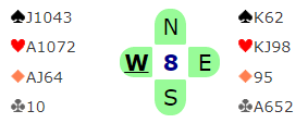 Det er klart at idet øst velger å åpne i tredje hånd med sin 11-poenger og de finner hjertertilpasningen vil vest oppjustere sine korts verdi. Men det blir av og til litt for mye Møllers tran på den måten, særlig når det dreier seg om kun en 4-4 tilpasning, og det er jo dessuten snakk om en utgang utenfor sonen. Nei, delkontrakt er ganske sikkert "vinneren" i det lange løp med slike kort.